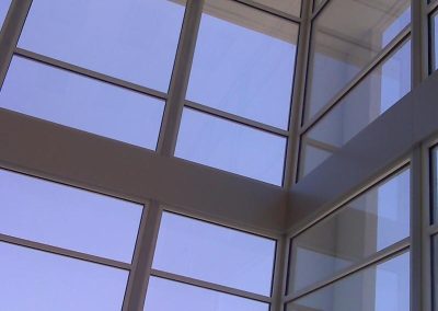 El aluminio, como perfeclo compañero del cristal, se adapta a las modulaciones necesarias, siempre respetando los estandares de seguridad del edificio.